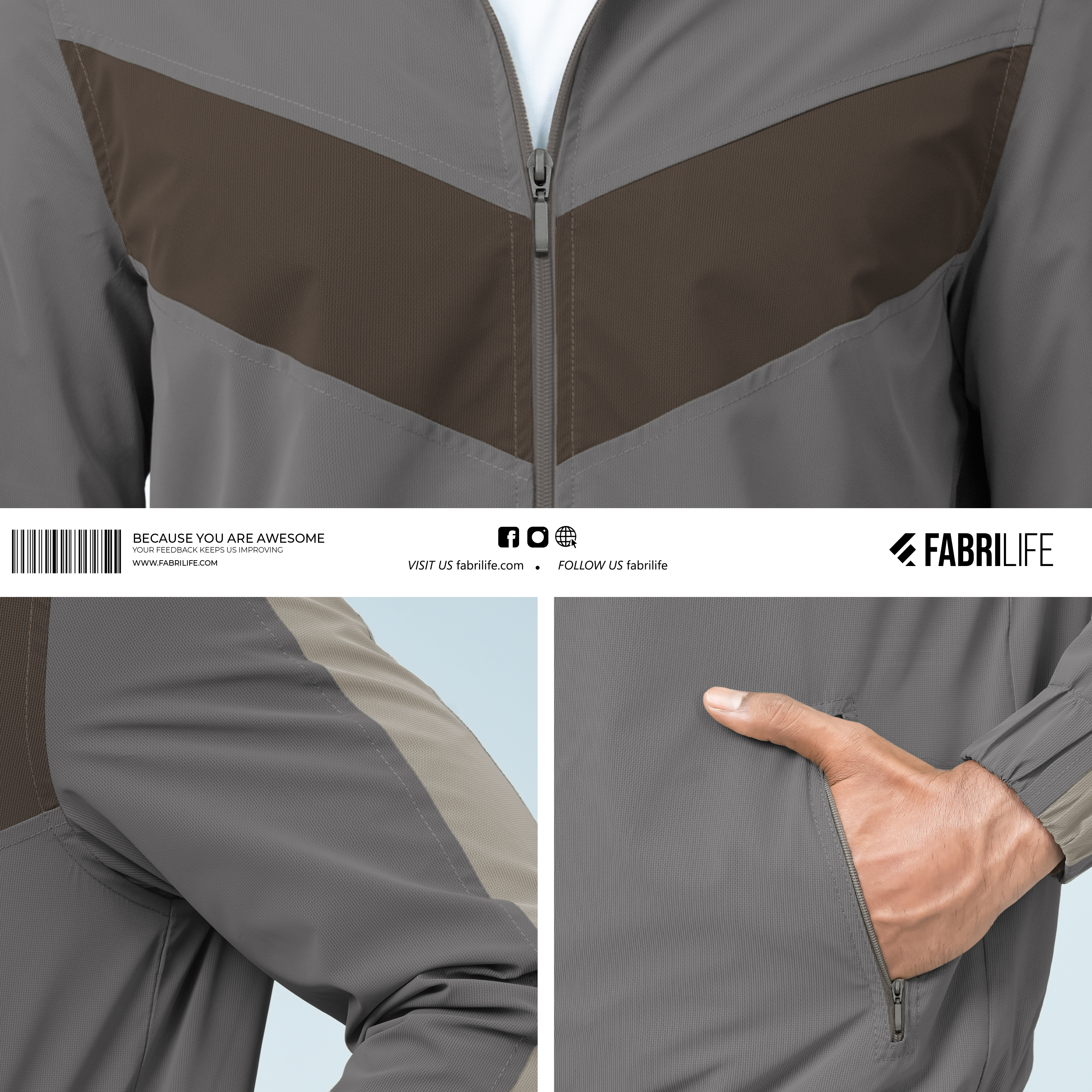 Shell Fabric: Coated (Ash, Chocolate, & Cream color-block).