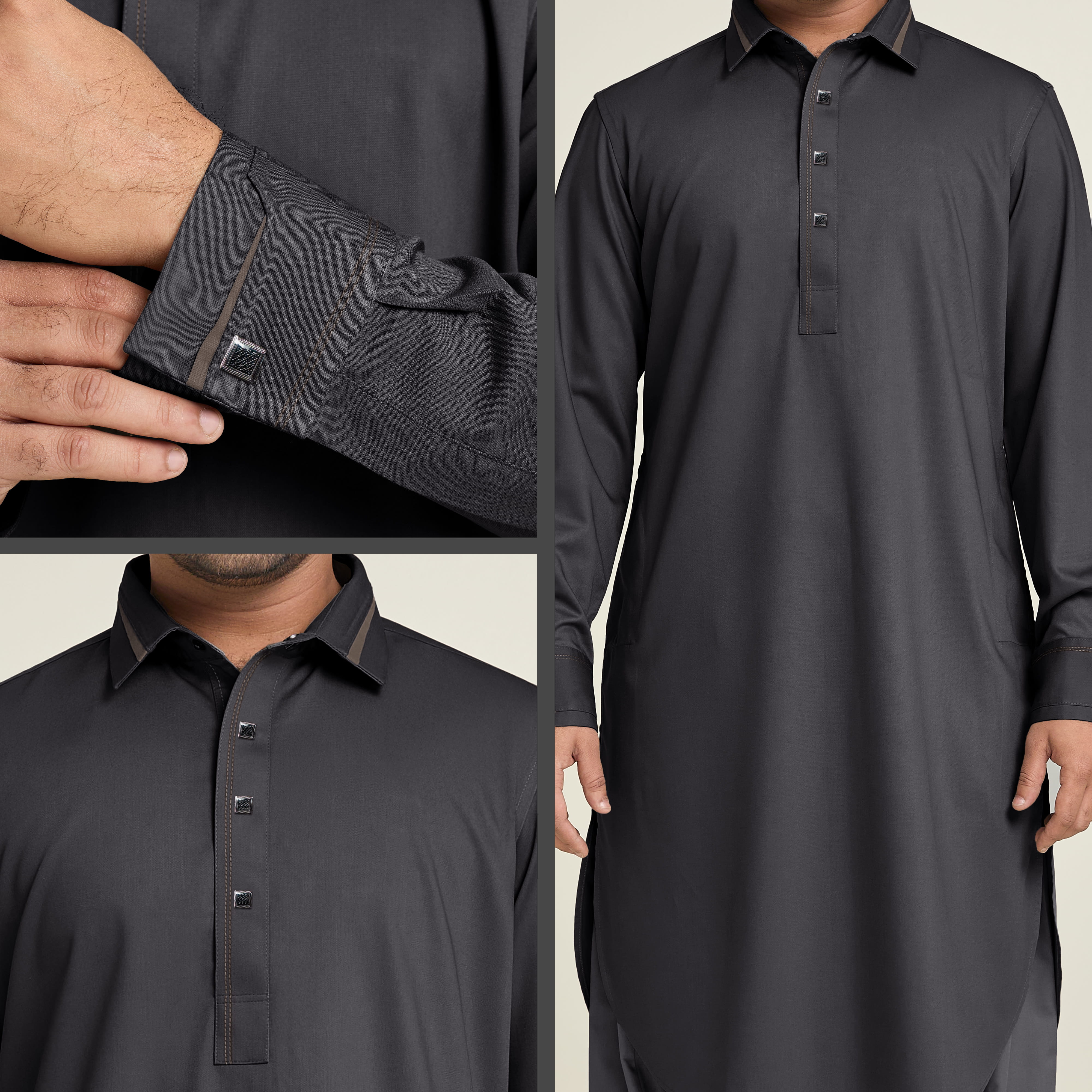 The Nawjar Premium Kabli Set is crafted for the man who carries tradition with graceful composure. Woven from a distinguished Ash 2/1 Z Twill fabric for both the top and bottom, the Nawjar radiates a calm, refined sophistication that sets it apart from the ordinary. Its understated Ash tone is both versatile and striking, equally fitting for Eid celebrations, formal ceremonies, family gatherings, or prestigious social occasions. Elevated by handcrafted Karchupi embroidery and a precisely fused finish, the Nawjar is where heritage meets modern mastery.