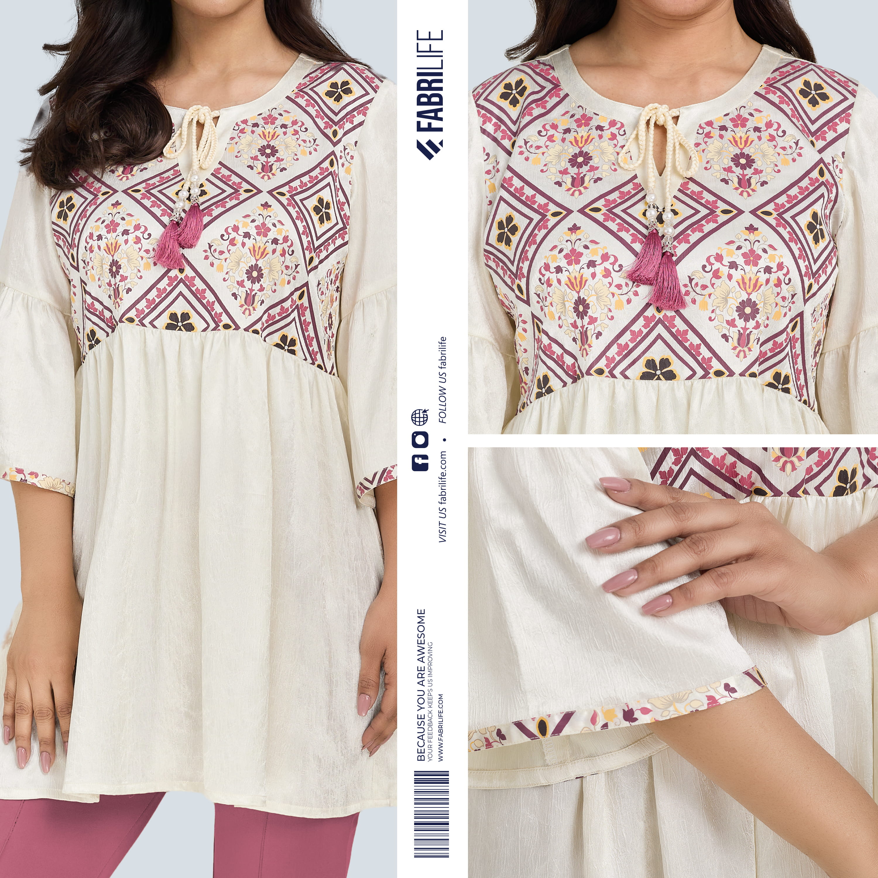 The Petra Premium Kurti is a celebration of timeless elegance and artisanal charm. Crafted from a soft cream georgette fabric, the Petra draws the eye with its intricate printed detailing and graceful tassel accents—a kurti that feels as beautiful as it looks. Whether worn at a festive gathering, a family celebration, or a relaxed afternoon outing, the Petra carries an air of quiet luxury that sets it apart.